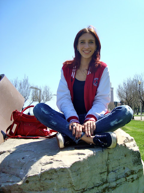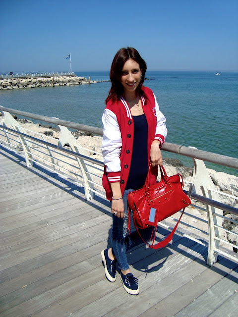 IT: Ed ecco il mio outfit di oggi! Una giornata a dir poco perfetta per una passeggiata in spiaggia, viste le temperature e il bel tempo. Un outfit tra colori forti e tenui. La maglietta che oggi ho indossato è semplice, tinta unita di colore blu, con sopra una specie di cardigan chiamato ”collage style” perchè si rifà alle divise indossate nei collage americani, messe da noi italiani soprattutto in quest’anno! Ho voluto abbinare questi due capi a dei jeans strappati e sportivi, con ai piedi le classiche Superga, mai passate di moda. Un altro new in è invece la borsa che indosso, rosso fuoco.