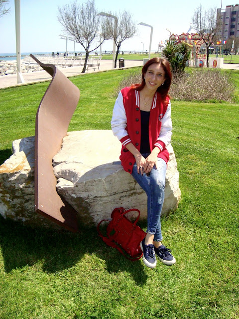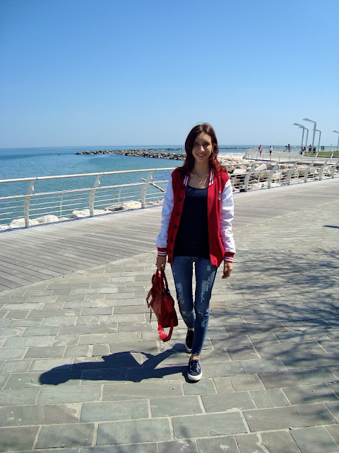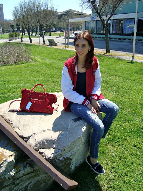 EN: And here’s my outfit today! A day to say the least perfect for a stroll on the beach, considering the temperatures and good weather. An outfit in strong colors and soft. The shirt that I wore today is simple, plain blue, with over a kind of collage style sweatshirt called” why” refers to felpone worn in collage Americans, Italian crafted by us especially this year! I wanted to combine these two leaders in ripped jeans and sports, with the foot the classic Superga, never out of fashion. Another is rather new in the bag that I wear red. I leave you with the photos and I wish you a good afternoon!