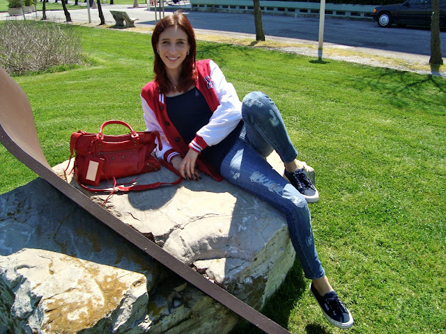 IT: Ed ecco il mio outfit di oggi! Una giornata a dir poco perfetta per una passeggiata in spiaggia, viste le temperature e il bel tempo. Un outfit tra colori forti e tenui. La maglietta che oggi ho indossato è semplice, tinta unita di colore blu, con sopra una specie di cardigan chiamato ”collage style” perchè si rifà alle divise indossate nei collage americani, messe da noi italiani soprattutto in quest’anno! Ho voluto abbinare questi due capi a dei jeans strappati e sportivi, con ai piedi le classiche Superga, mai passate di moda. Un altro new in è invece la borsa che indosso, rosso fuoco.